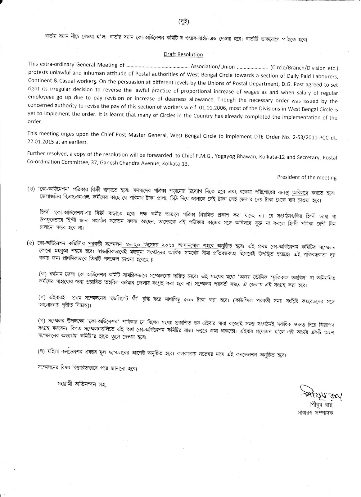 all Postal Circle Unions in and around Kolkata and Members, Editorial Board of